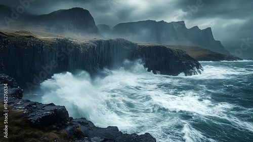 © BAYC, Fototapeta premium A stormy coast with waves breaking on the cliffs