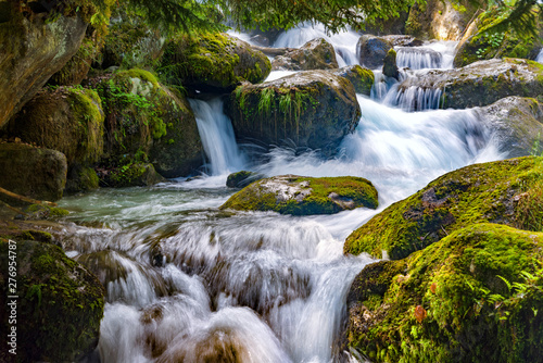 Fototapeta premium A stormy mountain river flows among huge stones in the forest slopes of the...