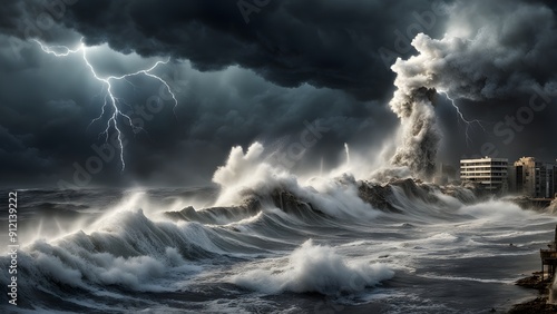 © Sutarto Stock, Fototapeta premium A stormy ocean with a large wave crashing into a building