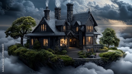© Thammarong, Fototapeta premium A storybook-inspired illustration of a family inside a magical floating house, drifting through the clouds