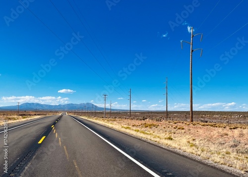 Fototapeta premium A straight desert highway in the American Southwest with uneven road markings, power lines, and distant mountains under a bright blue sky. Classic scenery of open road travel.