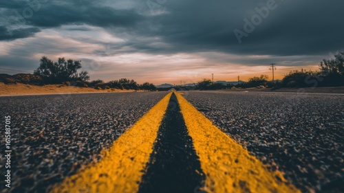© na, Fototapeta premium A straight desert road with yellow lane markers stretches to the horizon,