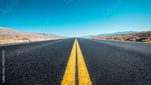 Naklejka premium A straight, empty highway in the middle of the desert, under a bright blue sky