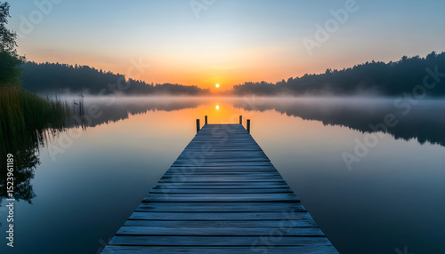 Naklejka premium A straight flat simplistic rectangular lake dock, beautiful sunrise, foggy,...