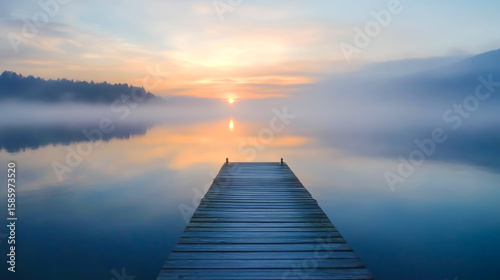 © Rezaul, Naklejka premium A straight flat simplistic rectangular lake dock, beautiful sunrise, foggy, calm water