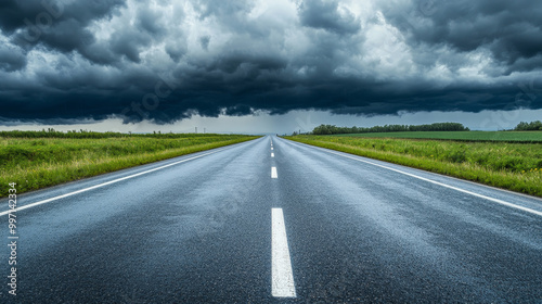 Naklejka premium A straight highway stretches through a natural landscape, dark rain clouds...