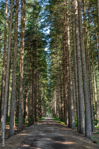 © Valentinos Loucaides, Fototapeta premium A straight path in the forest in Dolomites