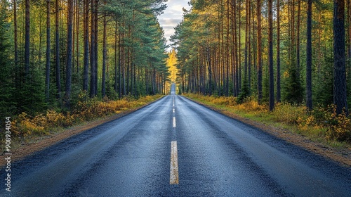 Fototapeta premium A straight road cuts through a dense pine forest with vibrant greenery and...