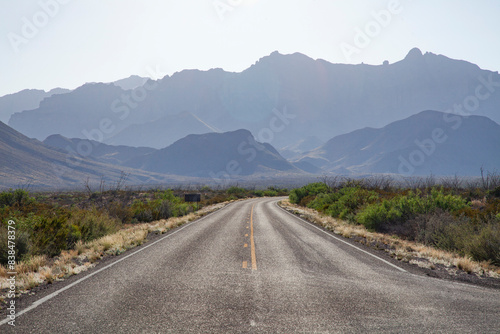 Naklejka premium A straight road goes into the horizon at the Chisos Mountains at Big Bend...