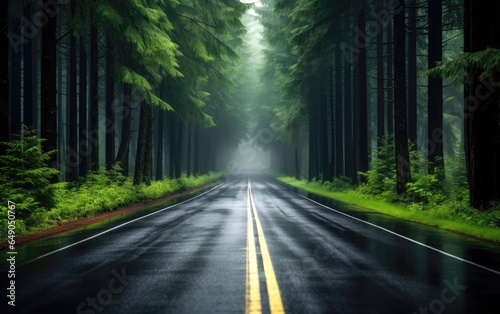 © piai, Obraz premium A straight road in the middle in rainy day with trees on both sides. Generative AI