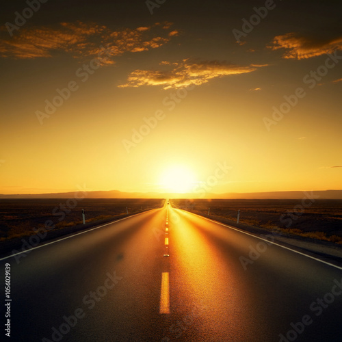 © BARETH, Naklejka premium a straight road stretching into the sunset across a deserted land sun shines in the horizon