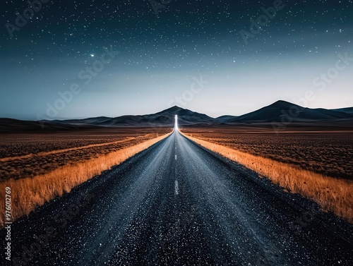 Naklejka premium A straight road through the desert, disappearing into the night, the stars...
