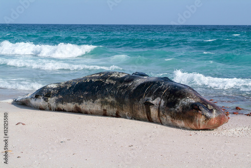 © fotoember, Naklejka premium A stranded sperm whale lies dead on the beach of Socotra island