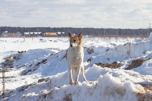 © Olga, Obraz premium A stray dog, white with red spots, stands on a snowy mountain in winter