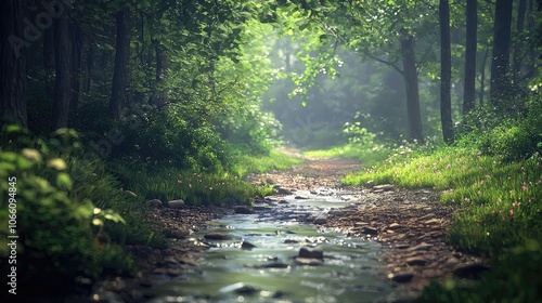 Fototapeta premium A Stream Flowing Through a Lush Green Forest with Sun Rays Shining Through...