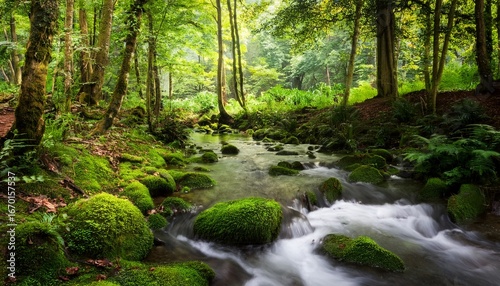 © Richard, Fototapeta premium a stream running through a lush green forest fille