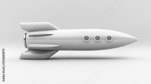© Blackmint Studio, Obraz premium A streamlined white rocket model rests against a simple background, highlighting its aerodynamic shape and distinct features. The polished surface reflects light, enhancing its modern aesthetic