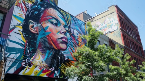 Naklejka premium 5. A street art mural on a building wall in a vibrant urban neighborhood,...