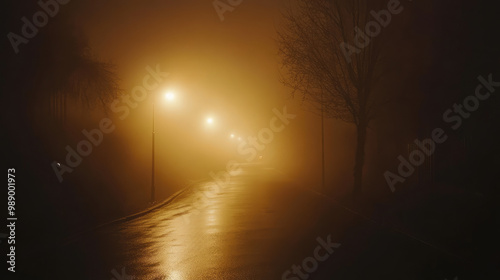 © Kanyanat, Obraz premium A street at night with fog and street lights