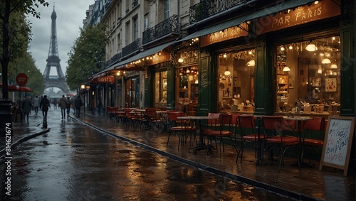 Fototapeta premium a street cafe in paris, Eiffel Tower, beautiful, raining