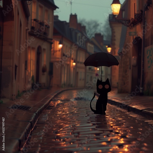 © Siripak, Obraz premium A street cat walks under the rain with an umbrella in a charming European alley, surrounded by old buildings.