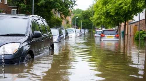 © Netsai, Fototapeta premium A street is heavily flooded with murky brown water, submerging numerous parked cars up to their wheels and doors.