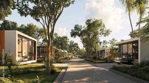 © Taisiia, Fototapeta premium A street lined with modular houses and adjacent trees