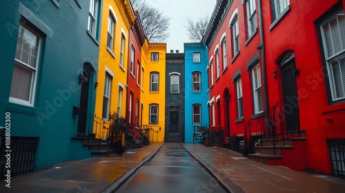 Fototapeta premium A street of monochrome buildings with one brilliantly painted house standing...
