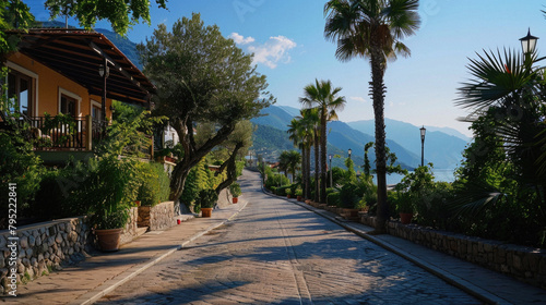 © Art AI Gallery, Fototapeta premium A street with palm trees and a house with a balcony
