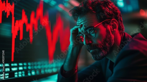 Fototapeta premium A stressed businessman holding his head in front of a stock market graph showing a sharp decline. Ideal for finance, economic crisis, and business stress themes.
