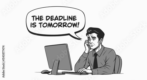 Fototapeta premium A stressed employee at a computer says, "The deadline is tomorrow!"