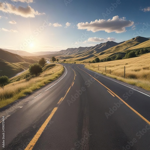 Naklejka premium A stretch of asphalt road winding through rolling hills under a sunny sky ,...