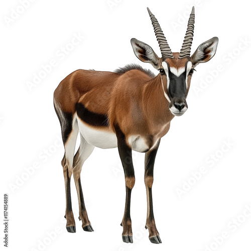 © PERFECTisME, Fototapeta premium a striking antelope with a sleek. slender body and distinctive twisted horns its fur features a mix of brown. white. and black patterns. showcasing its natural beauty and elegance the clean white back