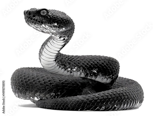 © CHAIYAPHON, Fototapeta premium A striking black and white image of a venomous viper coiled and poised defensively on a stark white background.