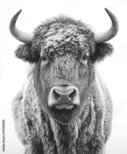 © Poj, Naklejka premium A striking black and white portrait of a Scottish highland cow with prominent horns