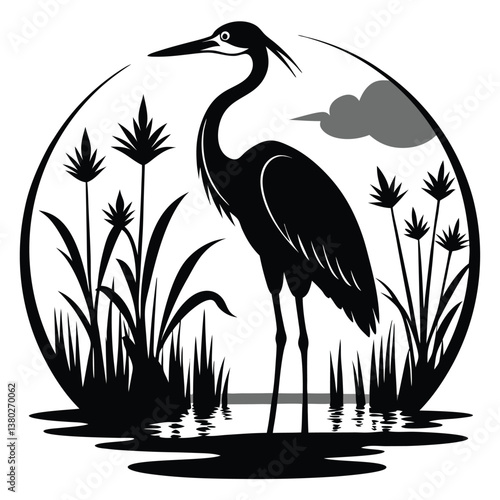 Fototapeta premium A striking black and white silhouette of a heron standing in water, perfect for nature, wildlife, and tattoo designs