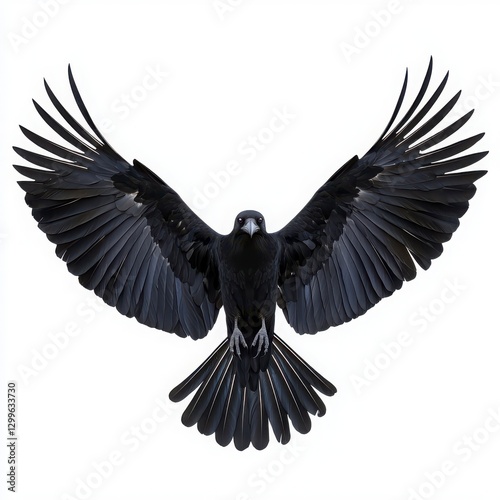 Naklejka premium A striking black bird with outstretched wings, showcasing intricate feather details against a white background.