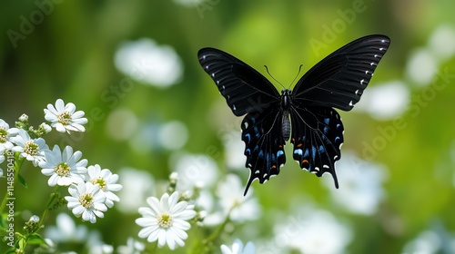 © BanklangArtshop, Fototapeta premium A striking black butterfly perched on delicate white flowers in a vibrant green garden setting, showcasing nature's beauty.