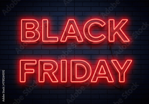 Obraz premium A striking “BLACK FRIDAY” sign written in bright red neon letters on a dark brick wall.