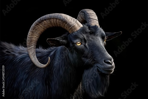 © pakawan, Naklejka premium A striking black goat with impressive long curved horns.