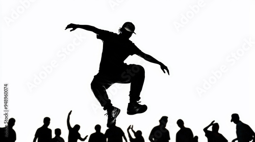 Obraz premium A striking black silhouette captures a street dancer mid-performance, frozen...