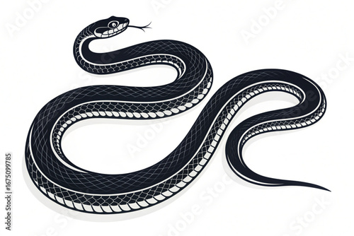 © Mahannan, Obraz premium A striking black snake with visible scales is isolated on a clean white background, highlighting its wild and dangerous nature