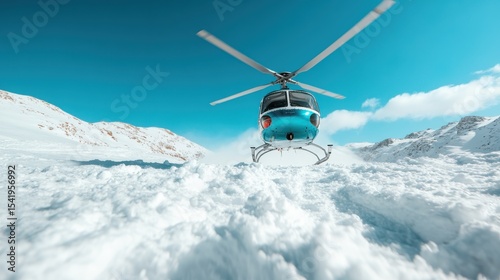 Obraz premium A striking blue helicopter hovers majestically over a pristine snowy...