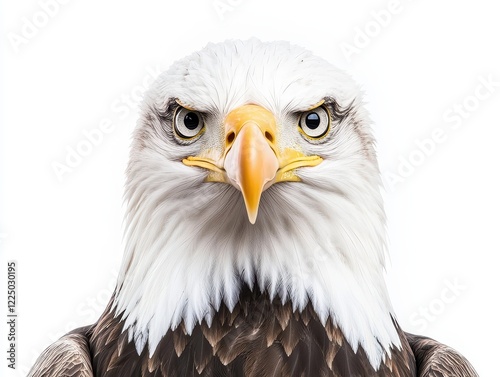 © AshrofS, Obraz premium A striking close-up of a bald eagle, showcasing its intense gaze, sharp beak, and distinctive white head feathers against a plain background.