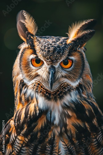 © Chudapa, Fototapeta premium A striking close-up of a Great Horned Owl, showcasing its vivid orange eyes and intricate feather patterns, set against a dark, blurred background