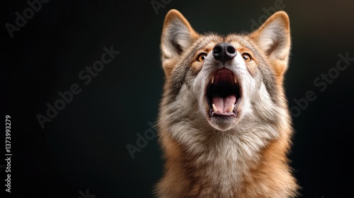 Naklejka premium A striking close-up of a howling coyote, showcasing its expressive features, beautiful fur, and piercing eyes in a captivating light against a dark backdrop emphasizing its wild essence.