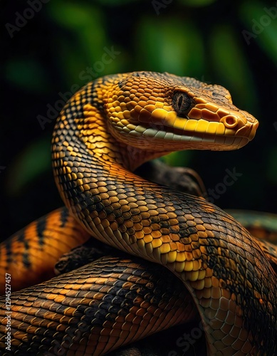Fototapeta premium A striking close-up of a snake with intricate golden and black scales, coiled...