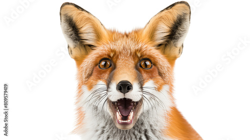 Fototapeta premium A striking close-up portrait of a red fox with its mouth open, transparent...