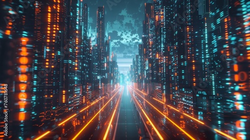 Fototapeta premium A striking 3D rendering that imagines an abstract highway weaving through towering digital binary