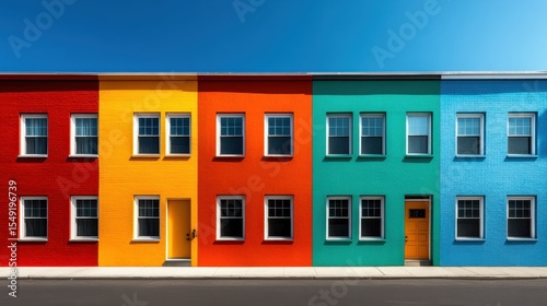 © Larisa AI, Naklejka premium A striking display of residential buildings painted in bright colors, showcasing a lively street scene that evokes feelings of joy and vibrancy in urban architecture.